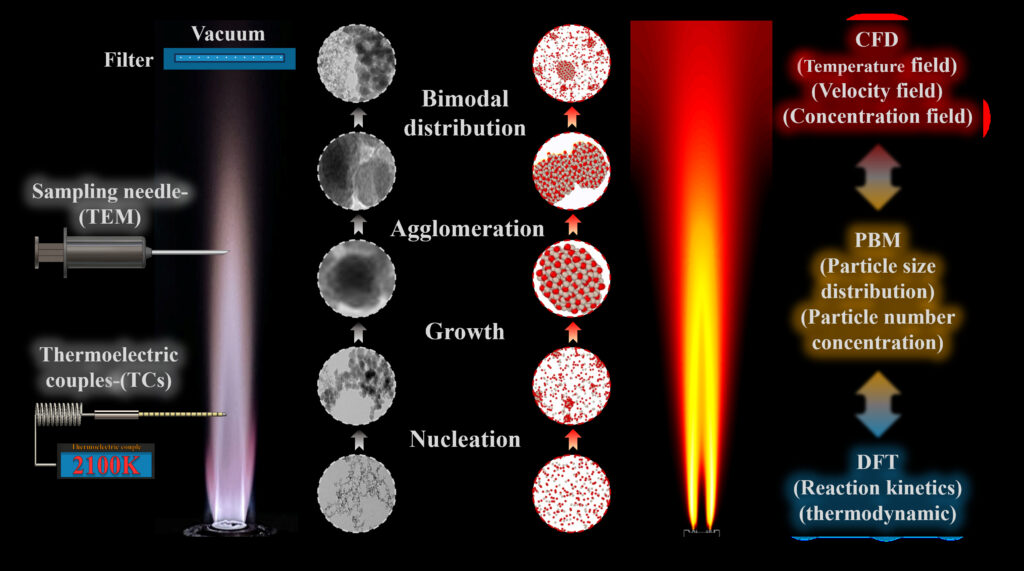 They then used these flow and temperature fields as the evolving environment for the population balance model. Nucleation was triggered once local supersaturation crossed the threshold determined by the kinetic scheme. Growth proceeded through both mass-transfer-limited and reaction-limited pathways, depending on position within the flame. Aggregation was represented using a fractal description that accounts for the open, chain-like structures typically observed in silica nanoparticle clusters. By tuning the nucleation and growth constants within physically justified ranges, the authors arrived at a model that generated self-consistent particle size distributions across the length of the reactor. The authors also compared simulation outputs against measurements taken at various flame heights to test the reliability of their predictions and the thermocouple readings confirmed that the CFD simulation and reproduced the thermal structure of the flame with only small deviations at locations where measurement artifacts are expected. The team performed transmission electron microscopy which showed that primary particle sizes increased steadily with height, a trend reproduced by the model. Moreover, optical particle sizing corroborated the predicted formation of larger agglomerates near the reactor exit.