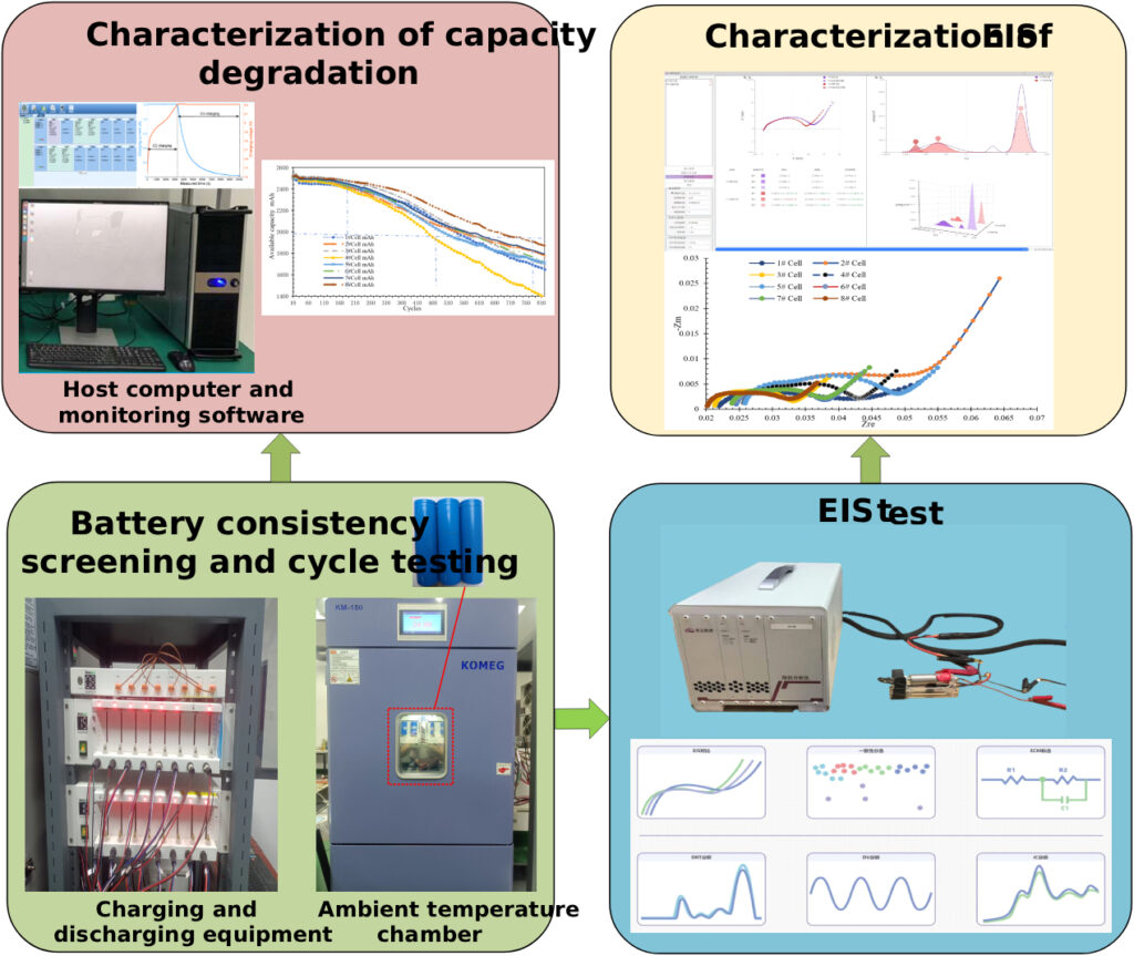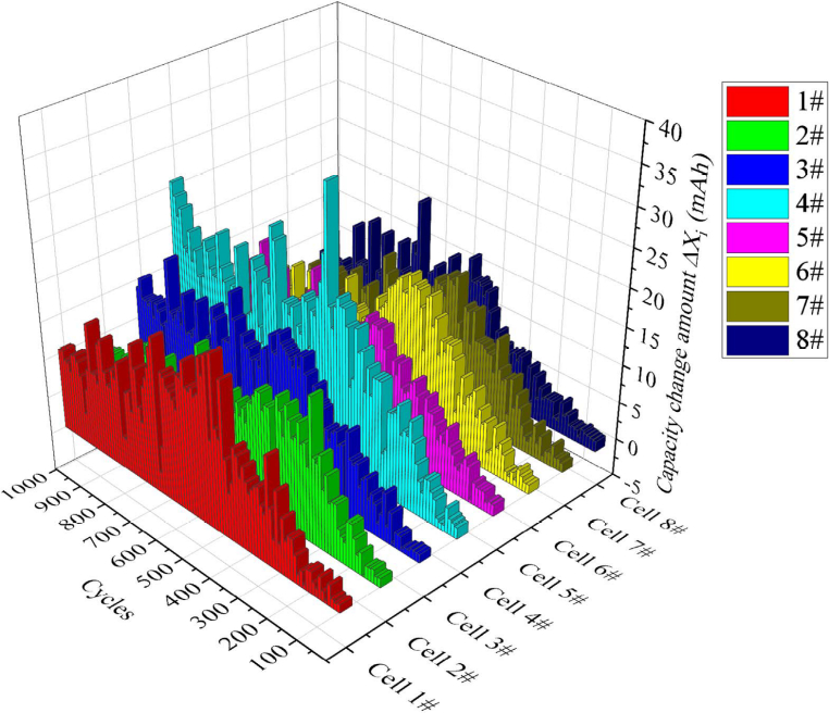 The research team performed a controlled aging experiment using eight commercial 18650 ternary lithium-ion cells selected from the same manufacturing batch to ensure that any observed variability would reflect intrinsic differences rather than sourcing inconsistencies. Before cycling, each cell was screened for basic consistency in capacity and impedance, confirming that nominal specifications aligned closely enough to permit a meaningful comparison of degradation behavior. The researchers then subjected all cells to repeated charge–discharge cycles under a fixed protocol: constant-current charging to a voltage cutoff, constant-voltage charging until the taper current fell to a predefined level, a short rest, and constant-current discharge down to the lower cutoff. Environmental temperature was tightly regulated to avoid confounding thermal effects. Throughout the cycling process, the system recorded voltage, current, capacity, and related parameters at high temporal resolution, yielding a long sequence of degradation increments for each cell.