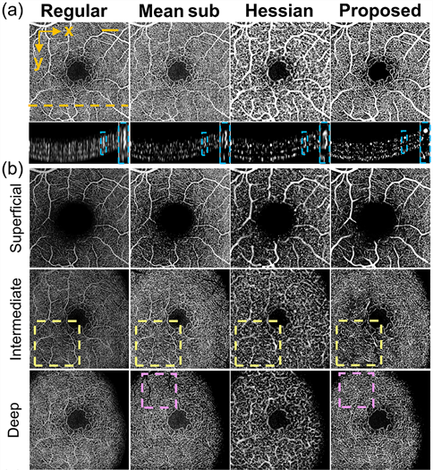 The research team used publicly available 3D OCTA datasets encompassing the retinal region from the internal limiting membrane to the outer plexiform layer. Using an image projection network (IPN), they first segmented large and small vessels from en face projections, ensuring accurate labeling of arteries, veins, and capillaries. These segmented masks were then multiplied slice-wise across volumetric data to isolate corresponding vessel populations. For each subset, they computed transverse thickness—a voxel-based estimate of vessel diameter—used as a guiding constraint along the axial dimension. The iterative algorithm enforced depth-wise continuity consistent with physiological vessel thickness, effectively truncating artificial axial extensions lacking morphological coherence. The authors excluded low-intensity background regions through a threshold set at 10 % of the mean signal intensity in capillary zones to prevent spurious connectivity between unrelated vessels and the resulting artifact-suppressed images of large and small vessels were merged and further enhanced using Hessian filtering to restore natural rod-like geometries. They evaluated the quantitative performance using three established metrics: peak signal-to-noise ratio (PSNR), structural similarity index (SSIM), and mean-squared error (MSE) computed between consecutive B-scans and found in all comparisons, the proposed method outperformed both mean subtraction and conventional Hessian filtering, producing higher PSNR and SSIM and lower MSE, which jointly signify improved image fidelity. Moreover, visual analysis reinforced these metrics. In the en face and cross-sectional views, the new method removed deep-layer tails that persisted in other techniques while preserving the weak capillary network beneath major vessels. In intermediate vascular plexuses, tail artifacts that typically overlap with functional layers were effectively eliminated, revealing a smoother and anatomically consistent structure. Although a fraction of vessel signals entirely masked by severe artifacts remained unrecoverable—a limitation acknowledged by the authors—the reconstructed data displayed a remarkable reduction in redundant information. Furthermore, the authors’ quantitative morphometric characterization showed that after artifact suppression, distributions of vessel directional variance, waviness, and local coverage became narrower, reflecting more coherent spatial organization. Using canonical discriminant analysis across ten normal and ten DR samples, classification accuracy between the two groups rose from 65 % (cross-validated) in standard OCTA to 90 % after correction. They found the most distinctive improvement appeared in local coverage, strongly affected by tail artifacts, which directly influenced vessel-density quantification. Additionally, disease-related markers such as microaneurysms and intraretinal vascular abnormalities were more clearly delineated, enabling a physiologically grounded interpretation of diabetic microvascular remodeling. Indeed the new method delivered both computational and diagnostic gains which validated morphology-constrained filtering as an effective tool for 3D OCTA analysis.