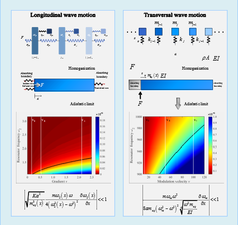 In conclusion, the work of Liu and Xiang establishes a principled foundation for designing graded structures with controlled, low-loss wave transport and provide explanation for why certain graded structures transmit waves efficiently while others suffer from severe scattering. Indeed, engineers can now appeal to a clear analytical condition that links spatial gradients directly to wave behavior. Implications of the new study are significant, for instance, unification of time- and space-based modulation concepts under a common adiabatic framework which deepens the theoretical understanding of wave control in structured media and suggests that many techniques developed for temporally modulated systems may be reinterpreted or adapted for spatially graded designs. For engineers, the ability to suppress reflection through controlled spatial grading has immediate relevance for waveguides, vibration isolation systems, and energy harvesting devices and in applications where back-reflection degrades signal quality or reduces harvesting efficiency, the space-adiabatic condition provides a direct route to performance improvement. The demonstrated enhancement in transmission and reduction of scattering highlight the practical value of slow, well-designed grading. The analysis of different grading profiles further emphasizes that adiabaticity alone is not the sole design consideration. And shows although slow gradients are essential for avoiding mode coupling, the spatial distribution of resonant frequencies also determines where energy localizes and how it flows through the structure. This view enables designers to tailor graded metamaterials to specific functional goals, whether to maximize transmitted energy, concentrate energy locally, or achieve a balance between the two. The authors’ new framework is not restricted to one-dimensional mechanical systems and can be extended to other wave systems and higher-dimensional structures which open opportunities in acoustic, elastic, and even electromagnetic metamaterials.