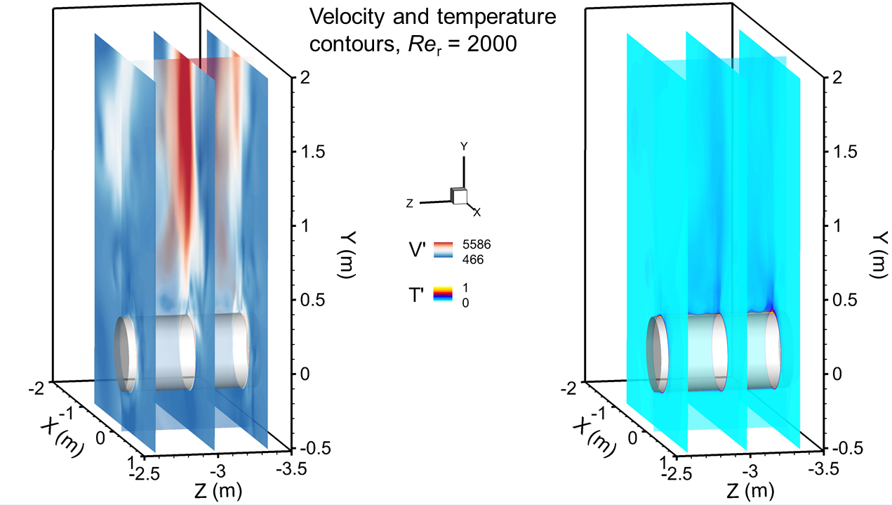The authors found that at low Rer (< 1.7 × 10⁴), buoyancy dominated and the computed fields displayed a vertical Rayleigh–Bénard plume rising from the cylinder top, obstructing upper-surface convection. Moreover, temperature contours revealed thin boundary layers and a highly stratified plume that reduced local Nusselt numbers near the top. Increasing Rer weakened this plume while promoting lateral flow attachment, causing surface temperature uniformity and a gradual rise in the mean Nusselt number (Nu). When rotation exceeded the critical Reynolds number, turbulent behavior emerged. The SST k–ω model reproduced the experimental Nu–Rer relationship with less than 4% deviation and an overall normalized root-mean-square error (NRMSE) of 0.035 compared with large-eddy simulations. Distinct transitions were identified: (i) plume detachment at Rer ≈ 2 × 10⁴, (ii) plume merging with the cylinder at 5.6 × 10⁴, and (iii) boundary-layer thickening and enhanced turbulent mixing beyond 7 × 10⁴. These dynamic changes altered the circumferential Nu(φ,z) profiles—lower on the descending side due to plume shading, higher near axial ends where boundary layers thinned. The team showed that visualization of cross-sections revealed thumb-like plumes at mid-span evolving into multiple small eddies near the ends which confirmed the need for three-dimensional modeling. Despite thicker boundary layers at higher speeds, intensified turbulence compensated by enhancing overall convective flux. They reported the mean Nusselt numbers to increase monotonically with Rer, which align with empirical correlations however, this exposed localized variations unseen in experiments. Additionally, the computed deflection angle of the trailing vortex also matched Schlieren images from previous studies and demonstrated less than 5% error in predicting plume orientation.
