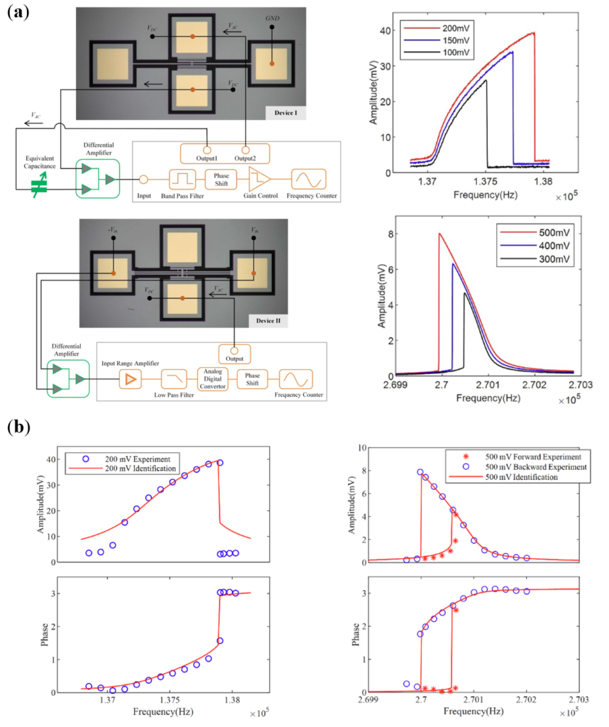 The research team examined the feasibility of variational-based data-driven identification using two MEMS resonators chosen to exhibit contrasting nonlinear characteristics. Both devices were doubly clamped beam structures, but their geometries and detection mechanisms differed, which led one system to display pronounced hardening nonlinearity and the other clear softening behavior. This contrast allowed the method to be tested across qualitatively different dynamical regimes. The authors found the resonators were electrostatically actuated near their fundamental modes and operated under high vacuum to suppress air damping. They acquired time-domain response signals using lock-in amplification, ensuring phase-resolved measurements under steady-state excitation. Rather than fitting these responses to a predefined oscillator model, the authors treated the measured voltage signals as generalized coordinates within a variational formulation. Carefully constructed variations, satisfying temporal boundary conditions, were introduced over short time segments of the recorded data.